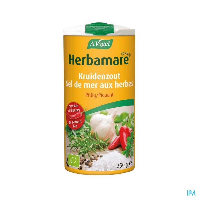 een mengsel van natuurlijk zeezout, biologisch geteelde groenten en kruiden.Het bevat chilipepers voor een pittigere smaak.Gebruik Herbamare® Spicy in plaats van zout om al uw gerechten op smaak te brengen.De oorsprong van Herbamare®Herbamare® zout bestaat al meer dan 60 jaar.Het wordt geproduceerd in onze Franse dochteronderneming in Colmar.Onze klanten in meer dan 25 landen waarderen het om zijn onvergelijkbare delicate aroma.De planten worden vers geoogst, gemengd met natuurlijk zeezout en zachtjes gedroogd.Een kleine hoeveelheid kelp-zeewier, gebruikt voor het natuurlijke jodiumgehalte, maakt het recept compleet.