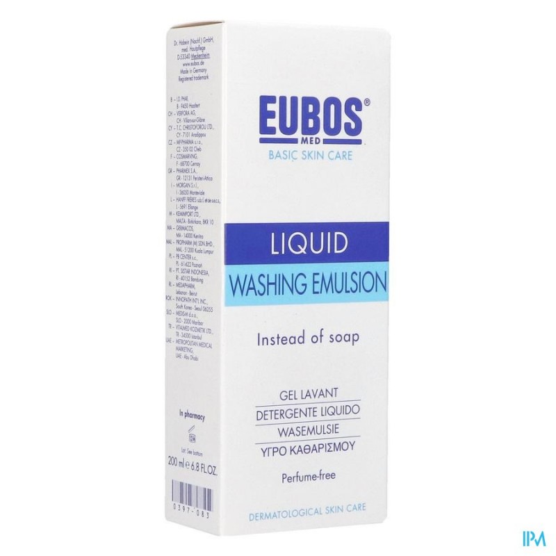 EUBOS LIQUID blauw, zonder parfumEUBOS LIQUID bevat geen alkalische zeep en heeft een fysiologische pH. De wasemulsie kan dus ook op doktersadvies gebruikt worden voor probleemhuiden, zoals een eczeemhuid. Problemen die ontstaan bij gebruik van een alkalische zeep (huidirritaties, dilatatie van de huid enz.) kunnen zich bij dit product dus niet voordoen.De reinigende actieve bestanddelen van EUBOS LIQUID bestaan uit de zachte combinatie laurylethersulfaat en amfo-acetaat van 6%. Uit fysiologische tests is gebleken dat dit product de lichaamshuid op een grondige manier reinigt zonder haar zachtheid aan te tasten. De huideigen hydraterende stoffen (Na-PCA = natriumpidolaat) en de allantoïne helpen bovendien huiduitdroging of -irritatie voorkomen.In tegenstelling tot veel andere producten die op dit moment in de hanel zijn, bevat EUBOS LIQUID geen vetinbrengende of teintverfrissende bestanddelen en laat het geen laagje achter op de huid.