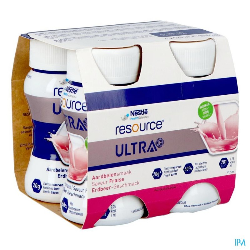 Resource Ultra+ is een eiwit? en energierijke voeding. Een flesje van 125ml bevat 20 g wei?eiwitten (28% kcal) en 281 kcal (2,25 kcal/ml). Voeding voor medisch gebruik bij ondervoeding of risico op ondervoeding bij volwassenen.