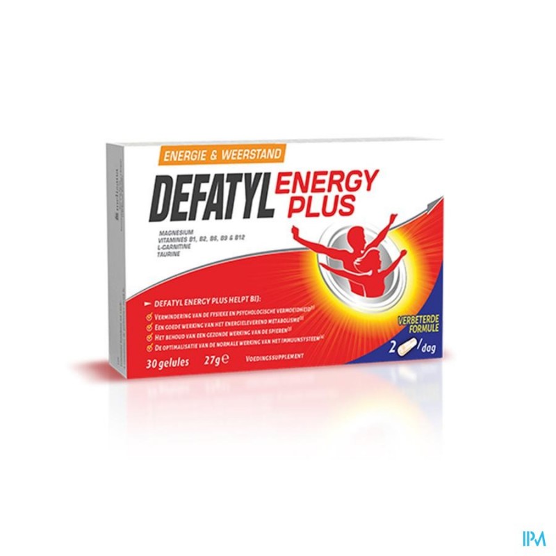 *RI referentie-inname Defatyl Energy Plus Caps 30 is een voedingssupplement, verkrijgbaar in uw buurtapotheek of online apotheek. Neem niet meer dan de aanbevolen dagelijkse dosis vermeld op de verpakking. Het vervangt geen gezonde levensstijl en gevarieerde en evenwichtige voeding. Vraag raad aan uw apotheker. Het product altijd buiten het bereik van kinderen houden.