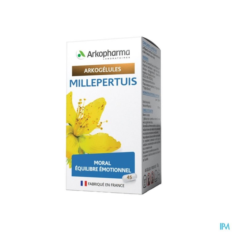*Maximaal gehalte aan hypericine : 0,7 mg per capsule.**Oorsprong EU/niet-EUGemiddelde voedingsinformatiePer één capsuleExtract van de bloeiwijze van Sint-Janskruid185 mg Arkocaps Sint Janskruid Plantaardig 45 is een voedingssupplement, verkrijgbaar in uw buurtapotheek of online apotheek. Neem niet meer dan de aanbevolen dagelijkse dosis vermeld op de verpakking. Het vervangt geen gezonde levensstijl en gevarieerde en evenwichtige voeding. Vraag raad aan uw apotheker. Het product altijd buiten het bereik van kinderen houden.