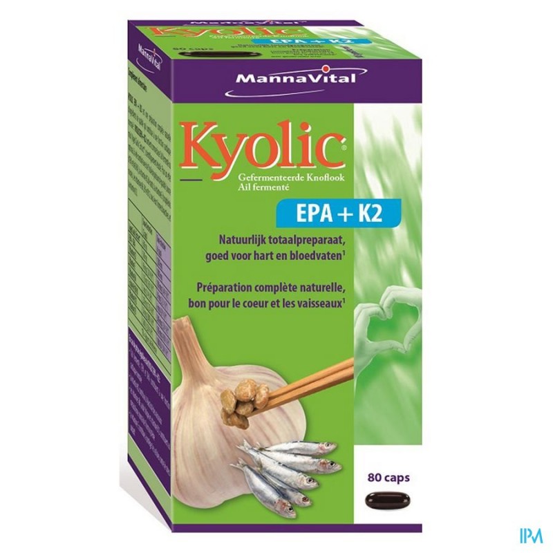 Door knoflook aan een bijzonder, 20 maand durend en gecontroleerd fermentatieproces te onderwerpen, ontstaat een actief en geurloos voedingssupplement, waarvan de bijdrage tot de gezondheid van hart- en bloedvaten door honderden studies is onderbouwd: KYOLIC Aged Garlic Extract®. Als deze gefermenteerde knoflook vervolgens wordt gecombineerd met kwaliteitsvolle visolie als bron van de omega-3-vetzuren EPA en DHA (eveneens toppers voor de bloedvaten), met vitamine K2 uit natto (voor het behoud van elastische vaten), met natuurlijke vitamine E (als celbeschermend antioxidans voor de bloedvaten) en met de bioactieve vormen van vitaminen B6, B9 en B12 (ter beheersing van homocysteïne), dan ontstaat met KYOLIC EPA + K2 een natuurlijke totaalformule voor de circulatie. Mannavital Kyolic Epa+k2 Caps 80 is een voedingssupplement, verkrijgbaar in uw buurtapotheek of online apotheek. Neem niet meer dan de aanbevolen dagelijkse dosis vermeld op de verpakking. Het vervangt geen gezonde levensstijl en gevarieerde en evenwichtige voeding. Vraag raad aan uw apotheker. Het product altijd buiten het bereik van kinderen houden.