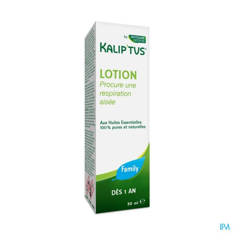 Verkouden? Kan je moeilijk ademhalen of wil je je weerstand versterken tijdens koude winterdagen?De Kalip\'tus® Lotion, op basis van 12 Essentiële Oliën, verzacht de luchtwegen en zorgt voor een vrije ademhaling. De Kalip\'tus Lotion kan in een verstuiver gebruikt worden of simpelweg op een zakdoek of op kleren.De Kalip\'tus Lotion kan ook preventief gebruikt worden om de natuurlijke weerstand te verhogen of om de lucht in de slaap- en andere kamers te zuiveren (via verstuiving). De aangename geur van o.a Eucalyptus radiata, Rozemarijn en Lavendel zorgen voor een gevoel van frisheid en wellness. Kalip\'tus Lotion Nf 30ml is een voedingssupplement, verkrijgbaar in uw buurtapotheek of online apotheek. Neem niet meer dan de aanbevolen dagelijkse dosis vermeld op de verpakking. Het vervangt geen gezonde levensstijl en gevarieerde en evenwichtige voeding. Vraag raad aan uw apotheker. Het product altijd buiten het bereik van kinderen houden.
