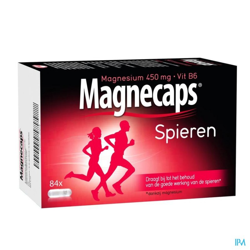 Ingrediënten per 1 capsule (% Referentie-inname):Magnesiumoxide (450 mg Mg (120%)) ? Capsule: gelatine, schellak, propyleenglycol ? Vulstof: microkristallijne cellulose ? Antiklontermiddelen: magnesiumstearaat, talk ? Kleurstoffen: titaandioxide (E171), ijzeroxide (E172) ? Pyridoxine hydrochloride (1,4 mg Vit. B6 (100%)). Magnecaps Spierkrampen Caps 84 is een voedingssupplement, verkrijgbaar in uw buurtapotheek of online apotheek. Neem niet meer dan de aanbevolen dagelijkse dosis vermeld op de verpakking. Het vervangt geen gezonde levensstijl en gevarieerde en evenwichtige voeding. Vraag raad aan uw apotheker. Het product altijd buiten het bereik van kinderen houden. Omschrijving