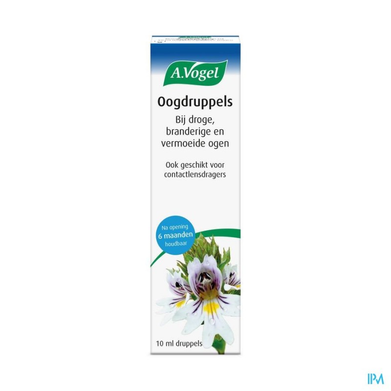 Geeft een snelle en aanhoudende bevochtiging en verfrissing.Helpt bij het behoud van voldoende traanvocht in het oog.Ook geschikt voor contactlensdragers.Verfrissend en bevochtigendSoms kunnen de ogen droog, branderig of vermoeid aanvoelen. Bijvoorbeeld als gevolgvan computergebruik, verwarming of juist airconditioning, ouderdom of het dragen van contactlenzen. A.Vogel Oogdruppels bevat verfrissende ingrediënten. Bovendien bevochtigt het de ogen en helpt bij het behoud van voldoende traanvocht.Met Hyaluronan en Euphrasia (ogentroost)Het Hyaluronan in A.Vogel Oogdruppels is gemaakt met onder andere plantaardige, niet genetisch gemanipuleerde soja en niet van dierlijke afkomst. Hierdoor zorgt het voor een snelle, aangename en aanhoudende bevochtiging en verfrissing van het oog.Unieke druppelflaconA.Vogel Oogdruppels is verpakt in een unieke druppelflacon. Het praktische druppelsysteem laat steeds maar één druppel vrijkomen, wat het doseren heel gemakkelijk maakt. Daarnaast blijft de vloeistof tijdens het gebruik steriel. Hierdoor zijn conserveringsmiddelen overbodig en zijn de druppels na opening nog 6 maanden houdbaar. Bovendien zijn de druppels hierdoor geschikt voor contactlensdragers en worden ze ook bij intensief gebruik goed verdragen.Gebruik bij contactlenzenAls u contactlenzen draagt, hoeft u deze niet uit te nemen voor het gebruik van de oogdruppels.
