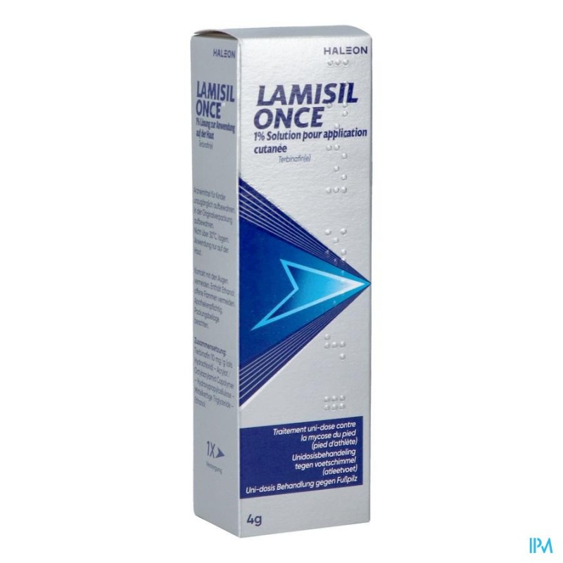 Welke stoffen zitten er in dit middel? De werkzame stof in dit middel is terbinafine (als hydrochloride). Elke gram oplossing voor cutaan gebruik bevat 10 mg terbinafine (als hydrochloride).De andere stoffen in dit middel zijn: acrylaat /octylacrylamide copolymeer, hydroxypropylcellulose, medium ketenlengte triglyceriden en ethanol. Wanneer mag u dit middel niet gebruiken?? U bent allergisch voor terbinafine of voor één van de stoffen die in dit geneesmiddel zitten.Deze stoffen kunt u vinden onder rubriek 6.Vertel uw arts of apotheker als dit voor u van toepassing is en gebruik geen Lamisil Once.Wanneer moet u extra voorzichtig zijn met dit middel?Neem contact op met uw arts of apotheker voordat u dit middel gebruikt.? Als u al een hele tijd last hebt van een schimmelinfectie op de voetzolen of de hielen, waarbij de huid harder en/of duidelijk afgeschilferd is, mag u dit geneesmiddel niet gebruiken. Raadpleeg uw arts als u denkt dat u aan deze aandoening lijdt, omdat het zou kunnen dat u dan een ander geneesmiddel nodig heeft.? Lamisil Once is enkel voor uitwendig gebruik. Gebruik het niet in de mond en slik het niet in.? Vermijd contact van de oplossing met uw gezicht, ogen of beschadigde huid, want de alcohol in het product kan irritatie veroorzaken (na blootstelling aan de zon of ernstige afschilfering van de huid).Als de oplossing per ongeluk in uw ogen terechtkomt, spoel die dan overvloedig met lopend water. Raadpleeg uw arts als u daar last van blijft ondervinden.? Alleen gebruiken voor de behandeling van de huid op uw voeten en tenen. Gebruikt u naast Lamisil Once nog andere geneesmiddelen, heeft u dat kort geleden gedaan of bestaat de mogelijkheid dat u in de nabije toekomst andere geneesmiddelen gaat gebruiken? Vertel dat dan uw arts of apotheker.Breng nooit andere geneesmiddelen of behandelingen gelijktijdig met Lamisil Once aan op uw voeten. Ook niet indien het producten betreft die u zonder voorschrift hebt gekocht. Zoals elk geneesmiddel kan ook dit geneesmiddel bijwerkingen hebben, al krijgt niet iedereen daarmee te maken.Mensen kunnen allergisch zijn aan Lamisil Once. Dit uit zich als opzwellen en pijn, jeuk, blaarvorming op de huid, huiduitslag of netelroos. Dit werd zeer zelden gerapporteerd (kan voorkomen bij 1 op 10 000 gebruikers).Als er bij u een allergische reactie of eender welke van de bovengenoemde verschijnselen zou optreden na het gebruik van dit product, dient u de film te verwijderen met behulp van gedenatureerde alcohol (die je in de apotheek kunt krijgen) en vervolgens uw voeten te wassen met warm water en zeep, ze af te spoelen en af te drogen, en uw arts of apotheker te raadplegen.Volgende bijwerkingen werden ook gerapporteerd:Soms voorkomend (kan voorkomen bij 1 op 100 gebruikers) Reacties op de plaats waar het product wordt aangebracht, waaronder uitdroging van de huid, huidirritatie of een branderig gevoel. Het gaat meestal om milde, voorbijgaande en ongevaarlijke reacties.Niet bekend (kan met de beschikbare gegevens niet worden bepaald) Verkleuring, vervelling en roodheid van de huid, pijn op de toedieningsplaats.Oogirritatie kan optreden indien per ongeluk aangebracht op de ogen.Het melden van bijwerkingenKrijgt u last van bijwerkingen, neem dan contact op met uw arts of apotheker. Dit geldt ook voor mogelijke bijwerkingen die niet in deze bijsluiter staan. U kunt bijwerkingen ook rechtstreeks melden via:Federaal Agentschap voor Geneesmiddelen en Gezondheidsproducten www.fagg.be Afdeling Vigilantie : Website: www.eenbijwerkingmelden.be E-mail: adr@fagg-afmps.beDoor bijwerkingen te melden, kunt u ons helpen meer informatie te verkrijgen over de veiligheid van dit geneesmiddel.