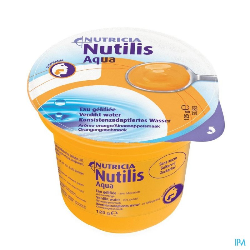 Nutilis Aqua is voeding voor medisch gebruik. Dieetvoeding bij dysfagie. Te gebruiken onder medisch toezicht. Kauwen en slikken is een ingewikkeld proces. Er zijn veel spieren bij betrokken: in uw lippen, tong, wangen, kaken, keel en het gehemelte. Als deze spieren niet goed samenwerken, kunt u problemen krijgen bij het slikken. Slikken gaat het best als eten of drinken glad en egaal zijn. Soms maakt een verdikte voeding het slikken makkelijker. Nutilis Aqua is verdikt water geschikt voor patiënten met (ver)slikproblemen (dysfagie). Nutilis Aqua is glutenvrij en laag in lactose. Speeksel heeft vele functies. Het bevat amylase en helpt onder andere bij de vertering van eten en drinken. Dit begint al in de mond. Een drank verdikt met een bindmiddel zoals maïszetmeel, wordt heel snel weer vloeibaar door speeksel. Nutilis® Aqua heeft amylaseresistente eigenschappen. Dat betekent dat speeksel nauwelijks invloed heeft op de dikte van het verdikte product. Hierdoor behoudt het de door u gewenste dikte. Nutilis Aqua is voeding voor medisch gebruik. Uw arts of diëtist adviseert medische voeding bij dysfagie, als aanvulling op de normale voeding. Gebruik Aanbevolen koel en droog te bewaren. Klaar voor gebruik en smaakt gekoeld het lekkerst. Geopend cupje is, mits goed afgesloten, maximaal 24 uur houdbaar in de koelkast. Indien direct uit het cupje geconsumeerd, restjes weggooien.