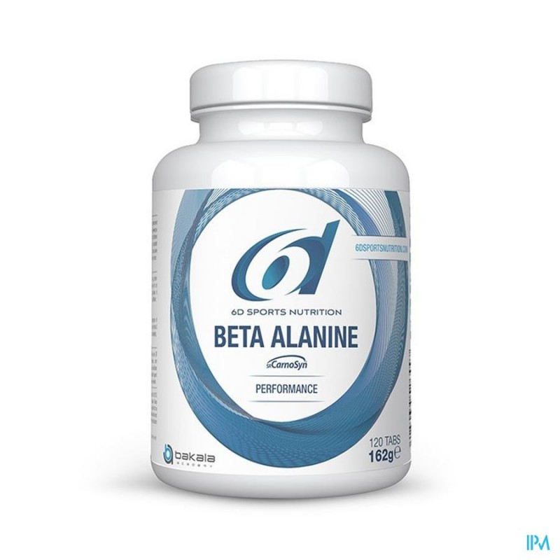 \"6d BETA-ALANINE SR CARNOSYN®\" bevat 800 mg bèta-alanine per tablet. Studies hebben aangetoond dat de bèta-alanine in de \"6d BETA-ALANINE SR CARNOSYN®\" tabletten beter wordt opgenomen ter hoogte van de spier omwille van de geleidelijke vrijgave in het lichaam, zeker wanneer de bèta-alanine wordt ingenomen bij een maaltijd. Ook de vervelende huidtintelingen (paresthesie) blijven door de geleidelijke opname, bij de meeste sporters, achterwege wanneer er 2 tabletten (= 1600mg) tegelijk worden ingenomen. Indien er wordt gekozen voor een bèta-alanine poeder of voor \"standaard\" capsules/tabletten treden symptomen van paresthesie alreeds op bij innames vanaf 800 mg.Samenvattend is de \"6d BETA-ALANINE SR CARNOSYN®\" uitermate geschikt voor alle sporters die (meermaals) voor een korte periode (0,5-10 minuten) een maximale inspanning moeten leveren. Deze korte maximale inspanningen komen o.a. voor bij atletiek en zwemmen, maar ook bij teamsporten zoals voetbal, en zelfs bij duursporten zoals wielrenen (bv. steile klim of finale van een wedstrijd). 6d Sixd Beta Alanine Sustained Release Comp 120 is een voedingssupplement, verkrijgbaar in uw buurtapotheek of online apotheek. Neem niet meer dan de aanbevolen dagelijkse dosis vermeld op de verpakking. Het vervangt geen gezonde levensstijl en gevarieerde en evenwichtige voeding. Vraag raad aan uw apotheker. Het product altijd buiten het bereik van kinderen houden.