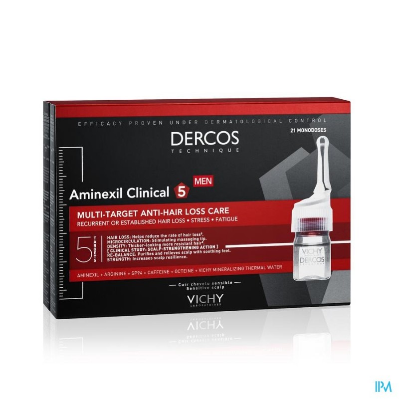 Dercos Technique Aminexil Clinical 5 Men is een gerichte kuur tegen haaruitval om haarverlies binnen 6 weken af te remmen. Deze kuur tegen haaruitval bij mannen pakt 5 punten aan: verankering, microcirculatie, weerstand, balans en kracht. Aminexil Clinical 5 bevat een unieke formulering verrijkt met Aminexil, een referentiemolecule op het gebied van producten tegen haaruitval met een klinisch bewezen efficiëntie en een complete werking. De behandeling biedt een optimale tolerantie, is hypoallergeen en is getest op gevoelige hoofdhuid.