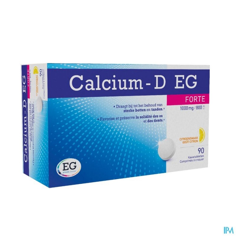 Kauwtabletten met citroensmaak: Calciumcarbonaat ? Zoetstoffen: xylitol, sorbitol, sucralose ? Vulstof: mannitol ? Antiklontermiddel: mono- en diglyceriden van vetzuren ? Citroenaroma - Vitamine D3.Kauwtabletten met muntsmaak: Calciumcarbonaat ? Zoetstoffen: xylitol, sorbitol, sucralose ? Vulstof: mannitol ? Antiklontermiddel: mono- en diglyceriden van vetzuren ? Natuurlijk muntaroma - Vitamine D3.Overmatig gebruik kan een laxerend effect hebben.Samenstelling per kauwtablet:- Calcium: 1000 mg (125% RI**)- Vitamine D3: 800 I.E. Calcium EG FORTE 1000Mg/800Ie Citroen Kauwtabl90 is een voedingssupplement, verkrijgbaar in uw buurtapotheek of online apotheek. Neem niet meer dan de aanbevolen dagelijkse dosis vermeld op de verpakking. Het vervangt geen gezonde levensstijl en gevarieerde en evenwichtige voeding. Vraag raad aan uw apotheker. Het product altijd buiten het bereik van kinderen houden.