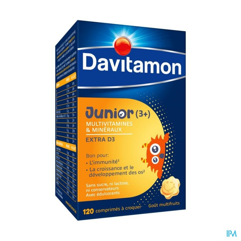 [1],[2] Vitamine D draagt bij tot de normale werking van het immuunsysteem en is nodig voor de normale groei en ontwikkeling van de botten bij kinderen. Davitamon Junior Mfruit V1 Comp 120 is een voedingssupplement, verkrijgbaar in uw buurtapotheek of online apotheek. Neem niet meer dan de aanbevolen dagelijkse dosis vermeld op de verpakking. Het vervangt geen gezonde levensstijl en gevarieerde en evenwichtige voeding. Vraag raad aan uw apotheker. Het product altijd buiten het bereik van kinderen houden.