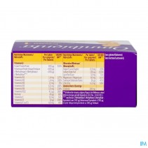 cholinebitartraat, magnesiumoxide- vulstof: microkristallijne cellulose, vitamine C, glansmiddel: hydroxypropylmethylcellulose- ferrobisglycinaat- vulstof: vernet natriumcarboxymethylcellulose- antiklontermiddel: dicalciumfosfaat- zetmeel- glansmiddelen: hydroxypropylcellulose, polyvinylalcohol, polyethyleenglycol, talk, vulstof: hydroxypropylcellulose, vitamine B3- maltodextrine, kleurstoffen: calciumcarbonaat, ijzeroxide rood- vitamine E- vitamine B5- zinkoxide- antiklontermiddel: magnesiumzouten van vetzuren- gemodificeerd zetmeel, gedroogde glucosesiroop- vitamine B6, emulgator, acaciagom- sucrose, vitamine B1- kopersulfaat, vitamine B2, calcium-L-methylfolaat- pteroylmonoglutaminezuur, kaliumjodide- natriumselenaat, d-biotine, vitamine D- vitamine B12 NutriëntenPer tablet%RIVitamine(s)Folaat