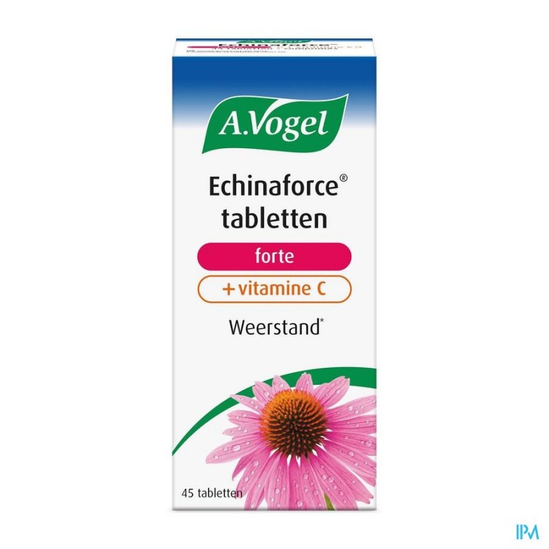 Helpt de natuurlijke weerstand te bevorderen (1).(1) Echinacea purpureaVitamine CA.Vogel Echinaforce + Vitamine C tabletten bevatten per stuk 60 mg natuurlijke vitamine C, verkregen uit de vruchten van Malpighia punicifolia. Deze vruchten staan bekend als een van de rijkste natuurlijke bronnen van vitamine C.Vitamine C is nodig voor een goede weerstand. Verder is het een antioxidant dat, net als bijvoorbeeld vitamine E, zorgt voor de bescherming van onze lichaamscellen.Vitamine C verhoogt de weerstand, bevordert de opname van ijzer uit de maaltijd en speelt een belangrijke functie bij het behoud van gezonde botten, tanden, vaten en andere lichaamsweefsels.Mensen die roken hebben meer vitamine C nodig: bij hen wordt meer vitamine C afgebroken in het lichaam.Echinacea purpureaTijdens een studiereis in Noord-Amerika ontdekte Alfred Vogel bij de Oglala Lakota Indianen de Echinacea purpurea (rode zonnehoed). Black Elk, opperhoofd van de Oglala Lakota Indianen, deelde met hem de eeuwenoude kennis over de bijzondere eigenschappen van deze plant. Alfred Vogel kreeg enkele zaden van de plant mee naar Zwitserland, waar hij samen met een team het bekende natuurlijke middel Echinaforce ontwikkelde.In Echinaforce + Vitamine C 45 tabletten worden, volgens de laatste wetenschappelijke inzichten, een hoge concentratie verse Echinacea purpurea verwerkt.Eén tablet bevat 1220 mg Echinacea purpurea-extract.