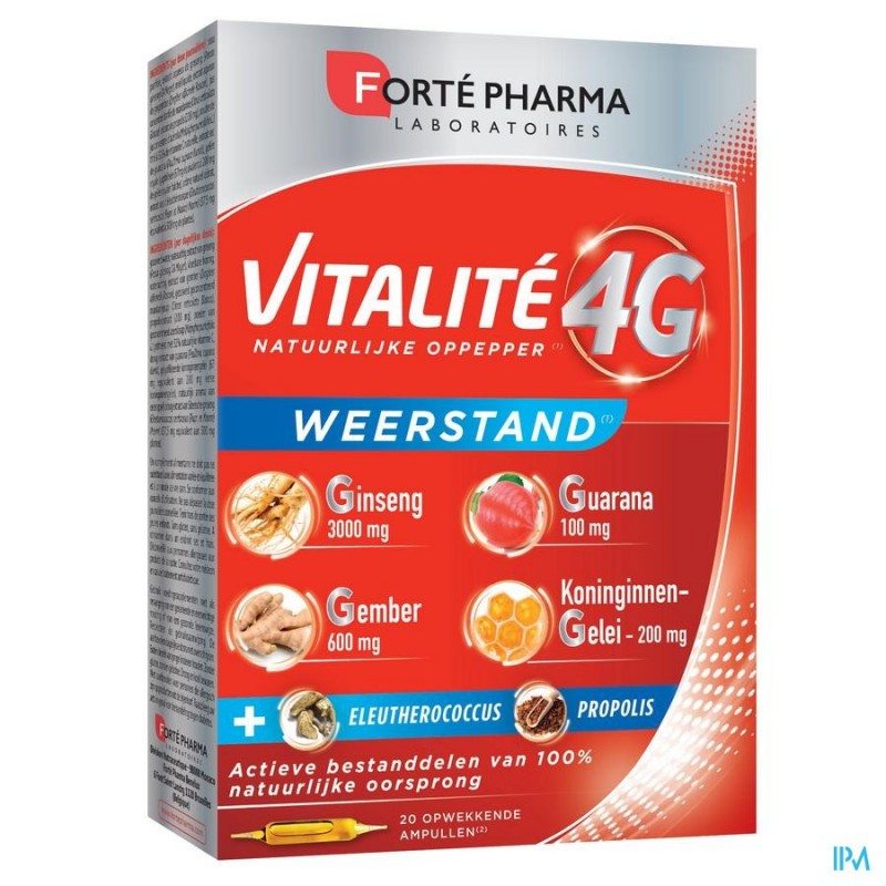 Geef uw energie en weerstand een natuurlijke boost!(1)Vitalité 4G Weerstand is een effectieve, natuurlijke oplossing om uw immuunsysteem te stimulerenen uw vitaliteit te behouden(1)!Hoog gedoseerd met actieve ingrediënten, geeft het u een ware, natuurlijke boost dankzij de combinatie van 4G-complex, eleutherococcus en propolis.De formule Vitalité 4G Weerstand biedt een dubbele werking om energie en weerstand te stimuleren !(1)De formule Vitalité 4G Weerstand is gebaseerd op het 4G-complex, een synergie van 4 optimaal gedoseerde, werkzame planten: Ginseng, Guarana, koninginnenGelei en Gember.Deze actieve ingrediënten worden gecombineerd met acerola, een Antillische bes die rijk is aan vitamine C, om uw energie een boost te geven(1).Twee ingrediënten maken de formule compleet om het immuunsysteem te stimuleren:- Eleutherococcus: een algemene tonic voor het lichaam, draagt bij tot de normale werking van het immuunsysteem.