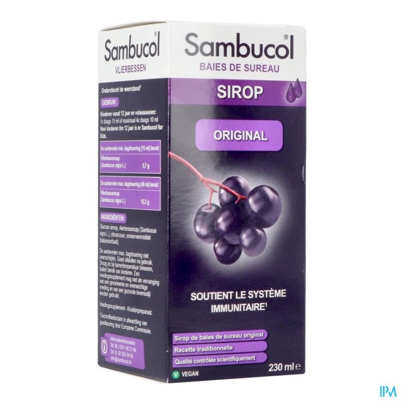 Sambucol The Original 230ml Nf is een voedingssupplement, verkrijgbaar in uw buurtapotheek of online apotheek. Neem niet meer dan de aanbevolen dagelijkse dosis vermeld op de verpakking. Het vervangt geen gezonde levensstijl en gevarieerde en evenwichtige voeding. Vraag raad aan uw apotheker. Het product altijd buiten het bereik van kinderen houden.