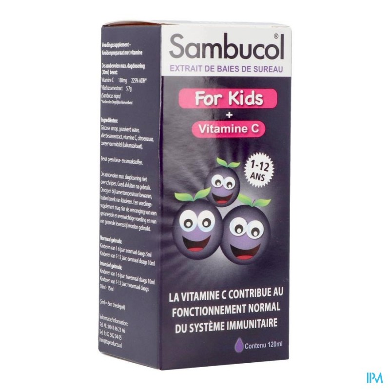 Sambucol For Kids 120ml is een voedingssupplement, verkrijgbaar in uw buurtapotheek of online apotheek. Neem niet meer dan de aanbevolen dagelijkse dosis vermeld op de verpakking. Het vervangt geen gezonde levensstijl en gevarieerde en evenwichtige voeding. Vraag raad aan uw apotheker. Het product altijd buiten het bereik van kinderen houden.